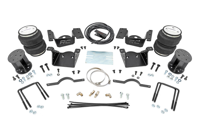 Ideal Leveling. Is your truck your workhorse? The main attraction to the pick-up line is the accessibility to haul and tow as desired. However, due to the amount of weight in the bed, or the condition of the vehicle's rear leaf springs, this can cause the vehicle to be un-level when under load. Here at Rough Country, we created an innovative new product to ensure that these are troubles of the past. Introducing, Rough Country's Rear Air Spring Kit. Heavy-duty Construction. Rough Country's Rear Air Spring Kit features two RC branded high-quality double convoluted airbags complemented with DOT-approved airlines. Whether you plan on towing or hauling in the not-so-distant future Rough Country's Air Spring kit is the must-have accessory to ensure that your trailer is level reducing the weight off of the tongue of your trailer. Each kit offers 1/4" push connector fittings and all of the bracketry needed to ensure installation is lightning fast and secure! Rough Country's Air Spring kit provides up to 5,000 lbs. of load support to ensure that you experience less sway and bottoming out when braking and steering! Installation. With an estimated timeframe of 1-2 hours this full kit can be installed at home using standard tools and can be completed efficiently and quickly! Limited Lifetime Replacement Warranty. Rough Country's Rear Air Spring Kit is backed with a limited lifetime replacement warranty towards manufacturer defects. As such, the product is protected from structural and workmanship damage after the date of purchase. With our industry-leading warranty give yourself peace of mind when using Rough Country's Suspension products!