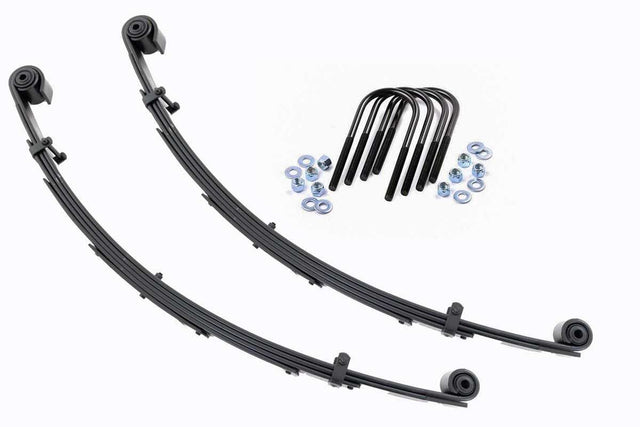 Added Lift Height and Ride Comfort. Take your suspension kit to the next level with Rough Country's Replacement Leaf Springs. Constructed from high-quality materials and designed specifically for the weight of your vehicle. This enhanced replacement spring will provide a factory-like feel while retaining your suspension lift height. Durable and Off-Road Ready. Rough Country's Replacement Leaf Springs are designed to tackle any terrain that they are faced with. Featuring a multi-leaf design and spring pads this reduces the friction and maximizes comfort. Each leaf pack utilizes tapered leaves for improved flexibility at their ends. Installation. Rough Country's Replacement Leaf Springs offer a 100% bolt-on installation estimated to take approximately 1-2 hours depending on vehicle condition. Simply remove the pre-existing leaf spring and use the stock hardware to equip your vehicle with this high-quality replacement. Lifetime Replacement Warranty. Rough Country's Replacement Leaf is backed with a 5-year replacement warranty towards manufacturer defects. As such, the product is protected from structural and workmanship damage after the date of purchase. With our industry-leading warranty give yourself peace of mind when using Rough Country's Suspension products!